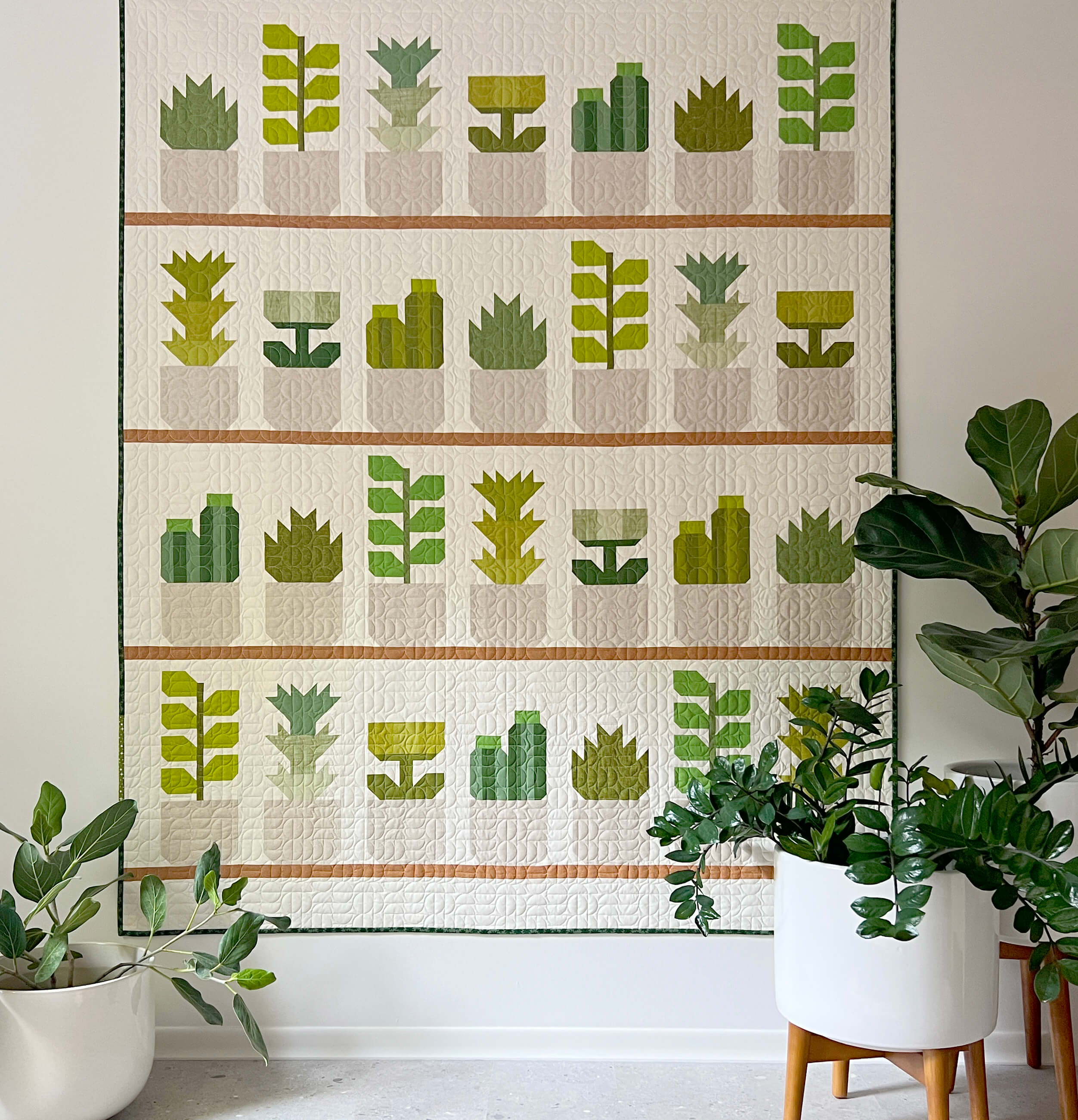 With the exception of the plant pots, all fabric is rotary cut and sewn together using conventional patchwork piecing. The sides of the plant pots are created using the included printable cutting guide. Please refer to the pattern back image for quilt sizes and materials requirements.